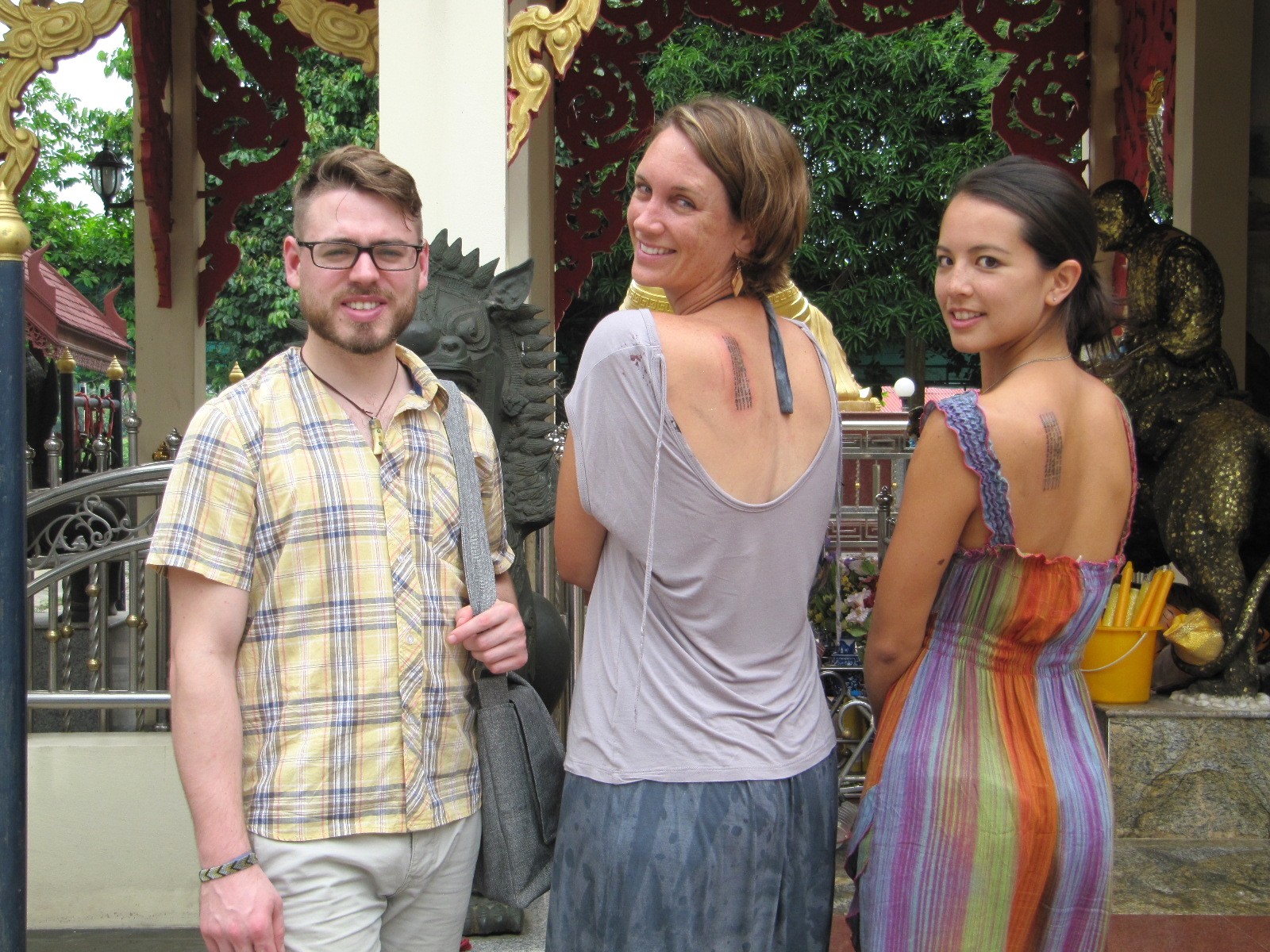 The three of us all got the same tattoo, called the Hah Taew, or five sacred lines. Though, Andrew got his on the right shoulder (I guess for men?) while Caitlin and I got ours on the left. The Hah Taew design seems to be the basic, starter Sak Yant given to first timers. Each of the five lines is a different prayer, or blessing. I’ve tried to look up what the prayers actually say, but there doesn’t seem to be an official translation on the interwebs. According to one site, it’s a blessing of “loving kindness, success in all aspects of life, charm, good luck and protection against evil spirits and the banishment of bad luck.”