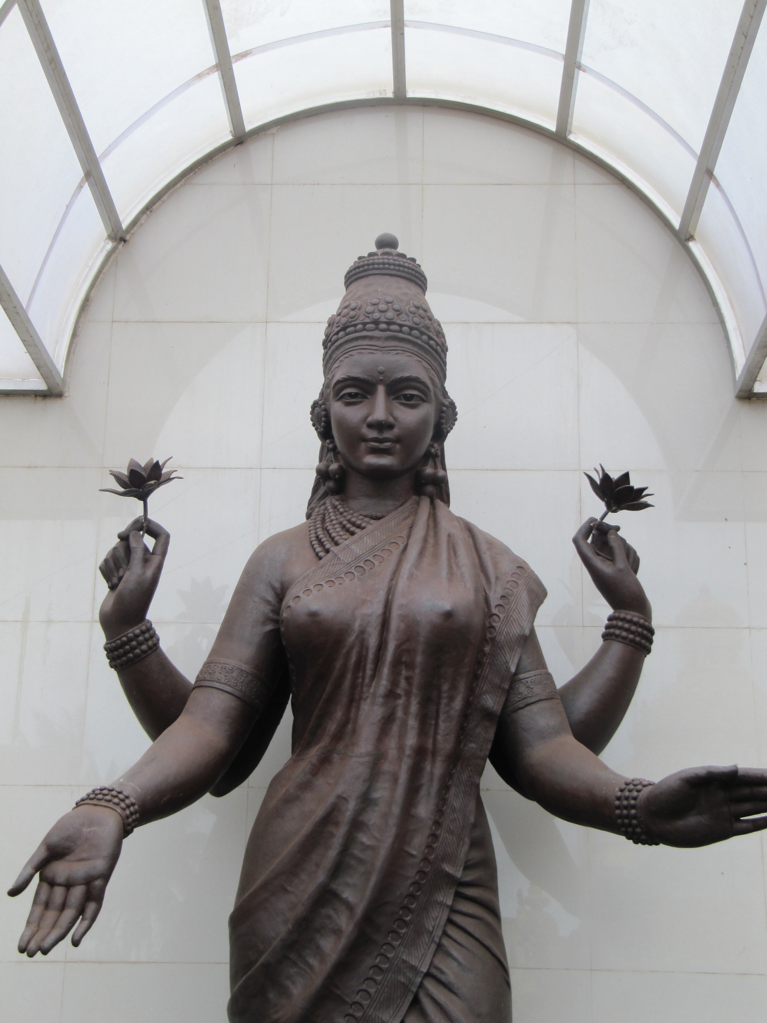 A Hindu goddess holding lotus flowers at at temple near Goa, India.