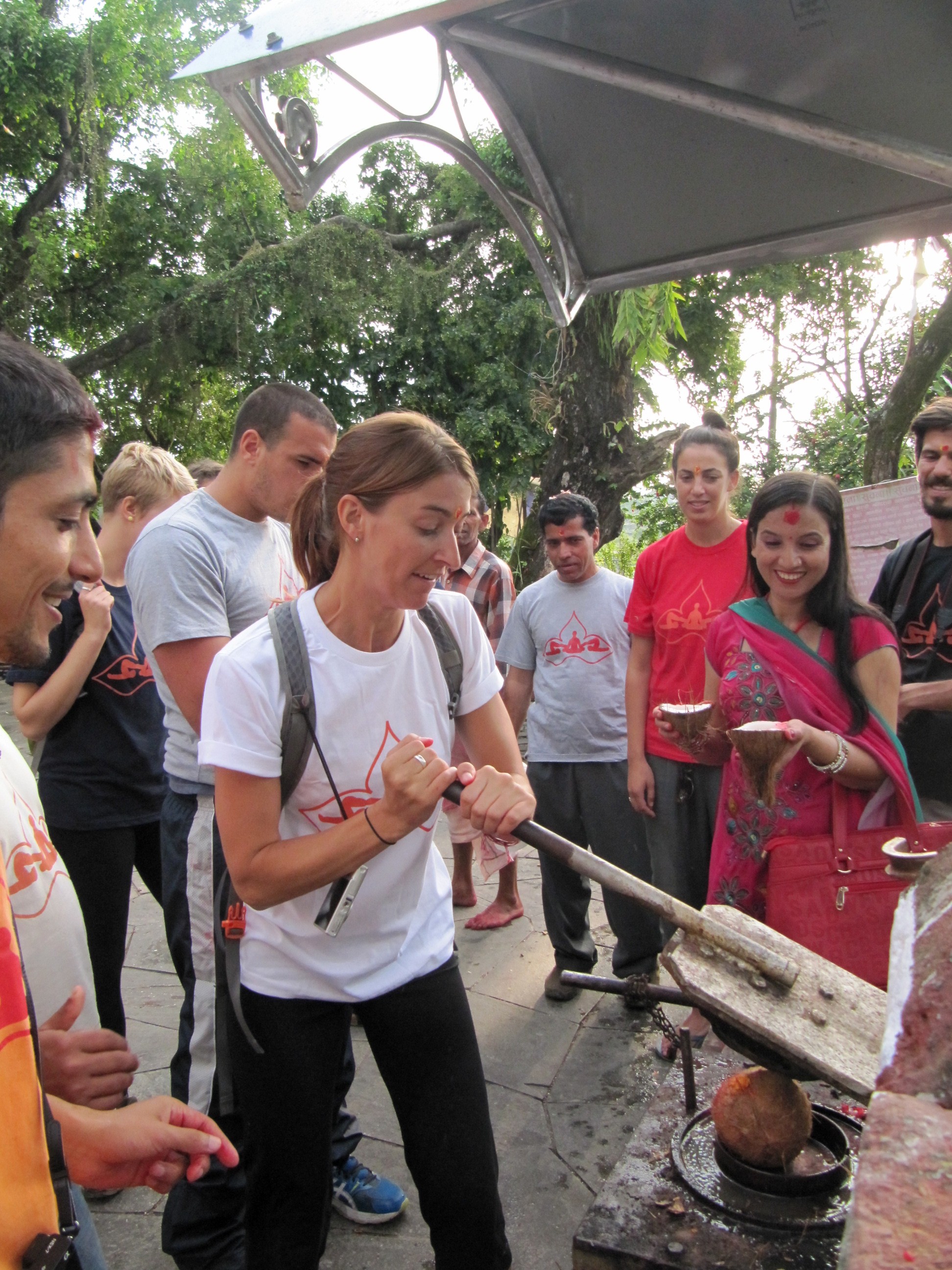At the temple on Fewa Lake in Pokhara, Nepal, there was a designated coconut-chopping machine located at the side of the main temple. Here, we were able to chop the coconuts we brought on site and share the water and meat amongst our group.