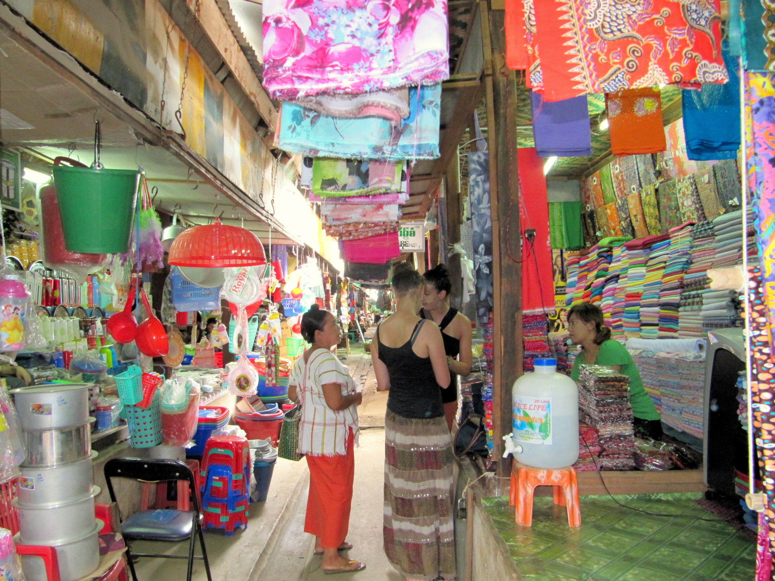 You can have a lot of fun picking out the fabric at the market, and the ladies will measure you and custom tailor it for you on the spot. There are also pre-made versions that are ready to wear. Here we are at the local market in Bagan where Jamie is getting a lesson on how to tie and tuck her brand new longyi: